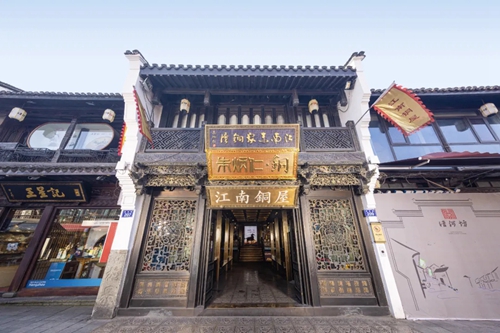 以朱炳仁團隊打造的銅屋系列為例:入駐亳都·新象的“中原銅屋”是其全國第四家、華中第一家銅屋。建筑內(nèi)部以超高、超寬的銅板工藝打造出“銅盒子”視覺焦點,磚木結(jié)構(gòu)搭配著銅與玻璃的碰撞,產(chǎn)生時空交錯的美感。“中原銅屋”整體風(fēng)格和中原民居相適配,當訪客的指尖掠過帶有紋飾的銅器,恰似完成一場跨越三千年的文明對話——要知道,商城遺址曾出土過杜嶺方鼎等商代青銅文明的巔峰之作,這份地域文化根脈在此得到了呼應(yīng)。