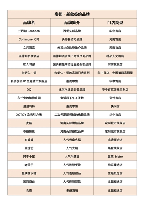 發(fā)布會上,蘭巴赫LENBACH華中首店、COMMUNE幻師河南首店、米其林必比登推薦的文興酒家河南首店、溫德姆私享酒店、京A精釀河南旗艦店、朱炳仁·銅全國第四座銅屋“中原銅屋”華中首店、名創(chuàng)優(yōu)品IP主題城市旗艦店華中首店、XCTOY次元引力場華中首店、DQ華中首家蛋糕定制門店、布蘭兔的植物莊園鄭州首店…等品牌確定進駐項目,占比超30%的首進品牌,讓亳都·新象成為鄭州首發(fā)經(jīng)濟的策源地之一。