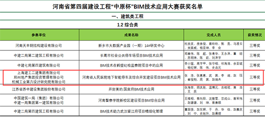 近日,由河南省住建廳指導(dǎo)、河南省建筑業(yè)協(xié)會主辦的河南省第四屆建設(shè)工程“中原杯”BIM技術(shù)應(yīng)用大賽獲獎名單揭曉,經(jīng)過層層評審,由鄭州地產(chǎn)集團(tuán)投資管理有限公司主導(dǎo),上海建工二建集團(tuán)有限公司、機械工業(yè)第六設(shè)計研究院有限公司配合完成申報的河南省人民醫(yī)院地下智能停車及綜合開發(fā)建設(shè)項目BIM技術(shù)應(yīng)用榮獲建筑類綜合成果三等獎。