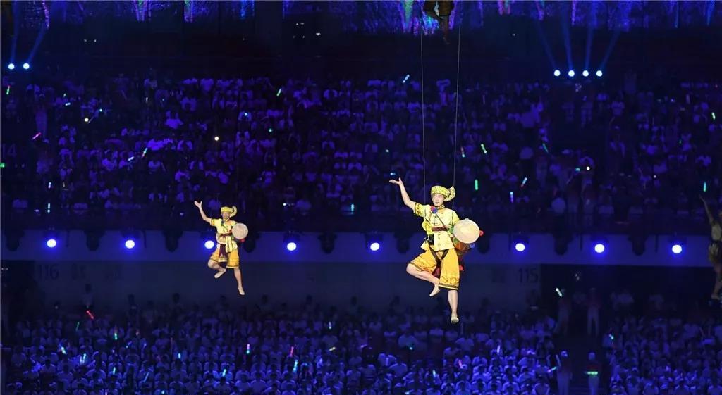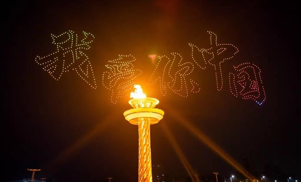 當(dāng)現(xiàn)場(chǎng)屏幕通過(guò)虛擬技術(shù)應(yīng)用,呈現(xiàn)出美麗的畫面,讓現(xiàn)場(chǎng)觀眾仿佛置身北國(guó)北川、南嶺飛瀑之中,觀眾都情不自禁地?fù)]舞起了手中的國(guó)旗為他們的表演喝彩!為我們偉大的祖國(guó)喝彩!1000架無(wú)人機(jī)從奧體中心廣場(chǎng)升起迅速變換成中中的造型,點(diǎn)燃民族運(yùn)動(dòng)會(huì)的火炬。